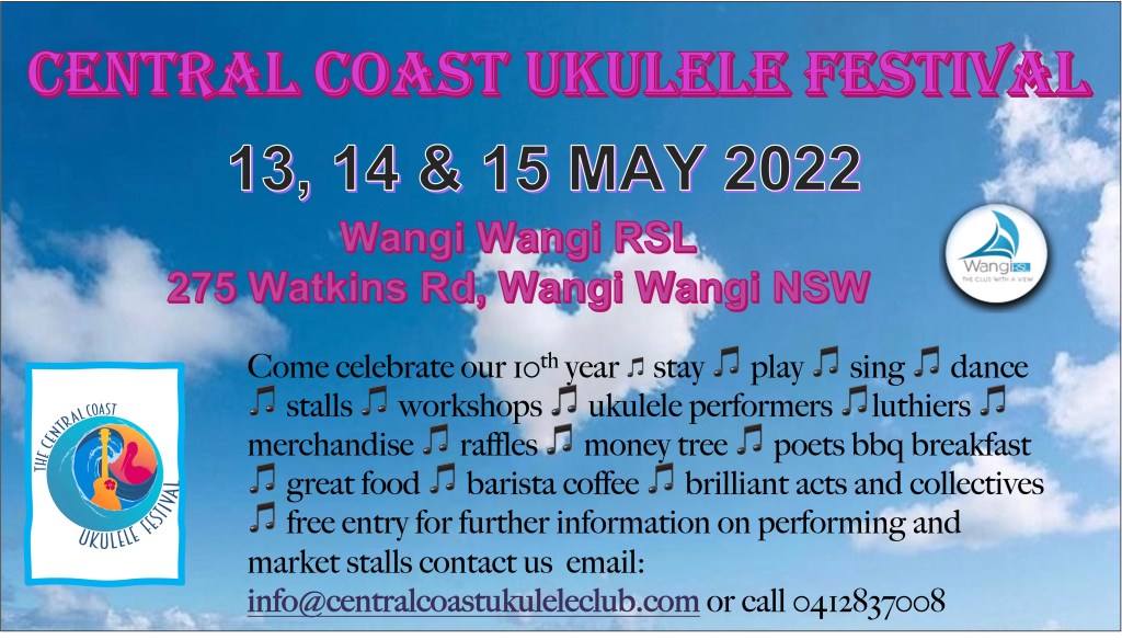 The Central Coast Ukulele Festival is a free event and we would like to thank Wangi Wangi RSL for making this happen and all our artists who are our sponsors plus our corporate sponsors who we will name shortly.