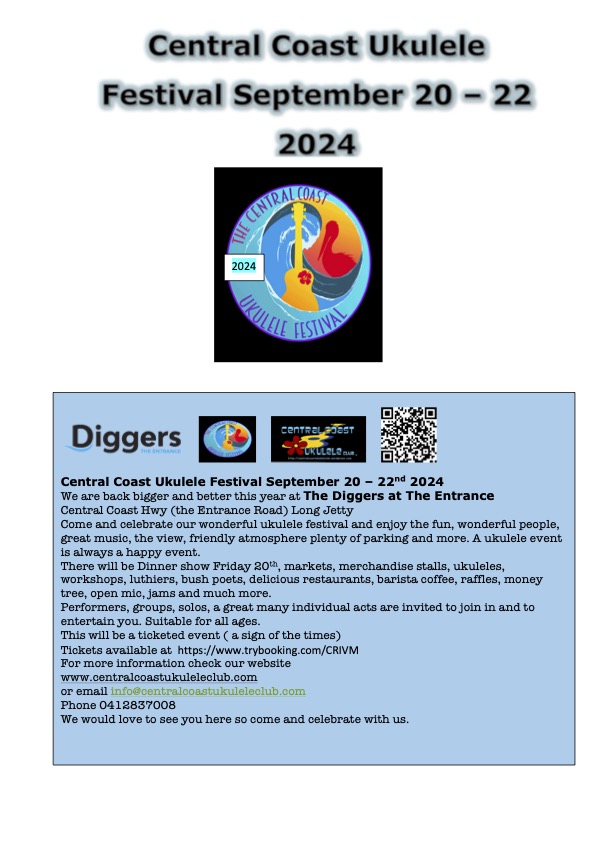 Central Coast Ukulele Festival September 20-22, 2024 at The Diggers@The Entrance Posted on April 27, 2024 by Central Coast Ukulele Club application-to-perform-2024-1Download Share this: Click to share on X (Opens in new window) X Click to share on Facebook (Opens in new window) Facebook Like Loading...